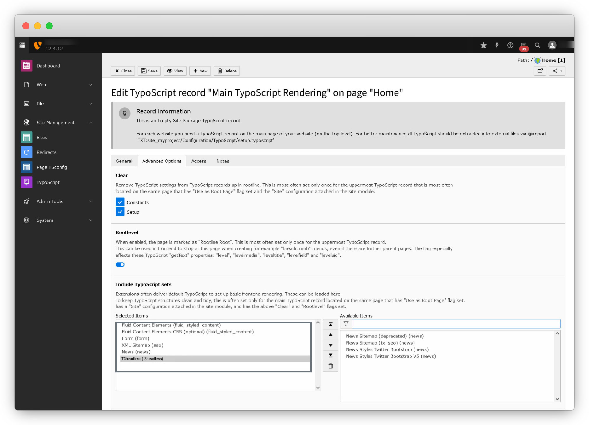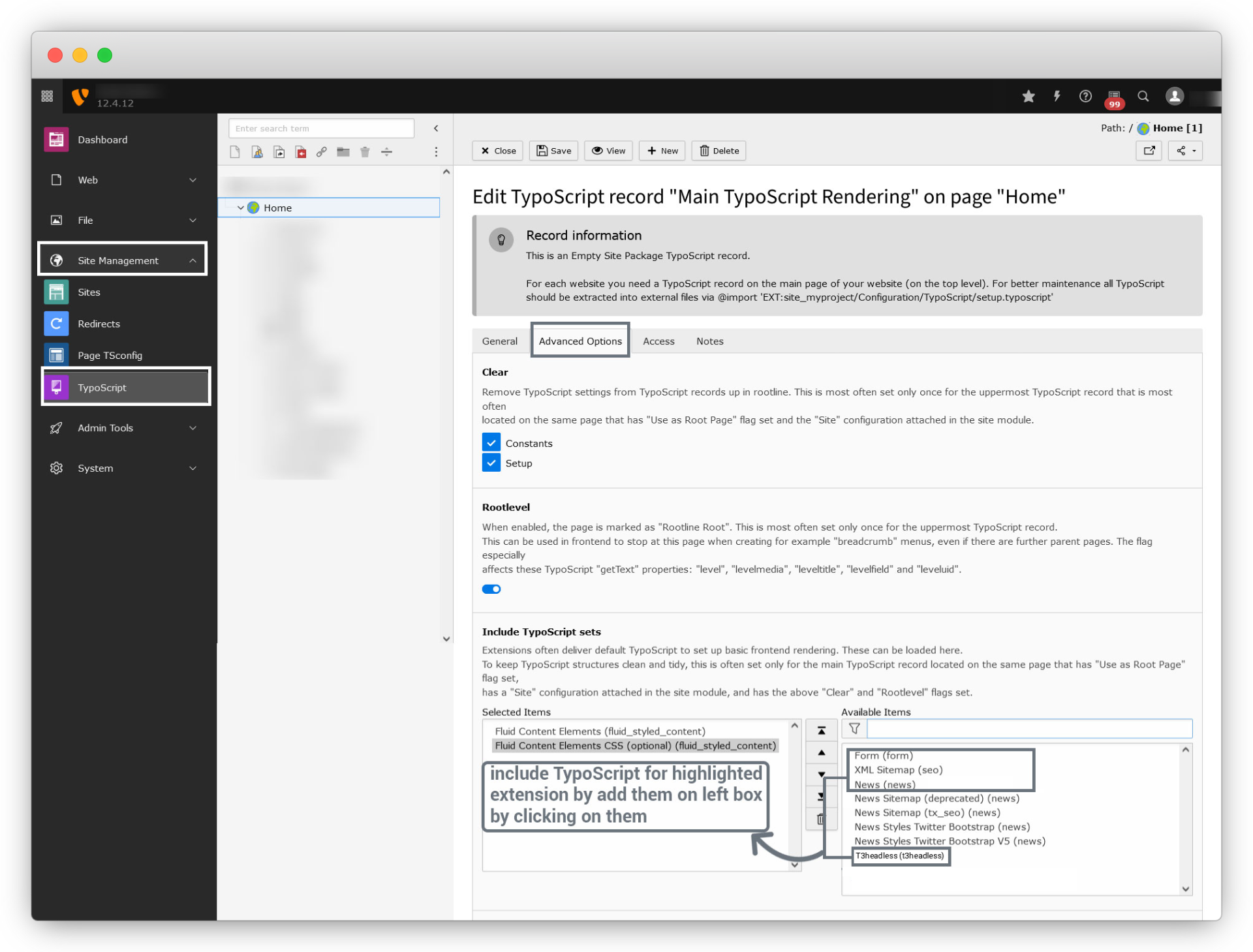 3. Go to the Advanced Options Tab and include the TypoScript of extensions in the following sequence.