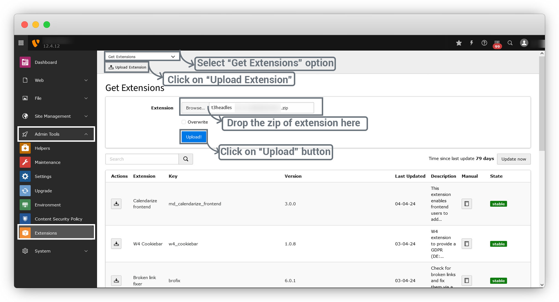 1. Click on Admin Tools > Extensions > Get Extensions > Upload Extensions and select & upload t3headless.zip, and then click on Save.