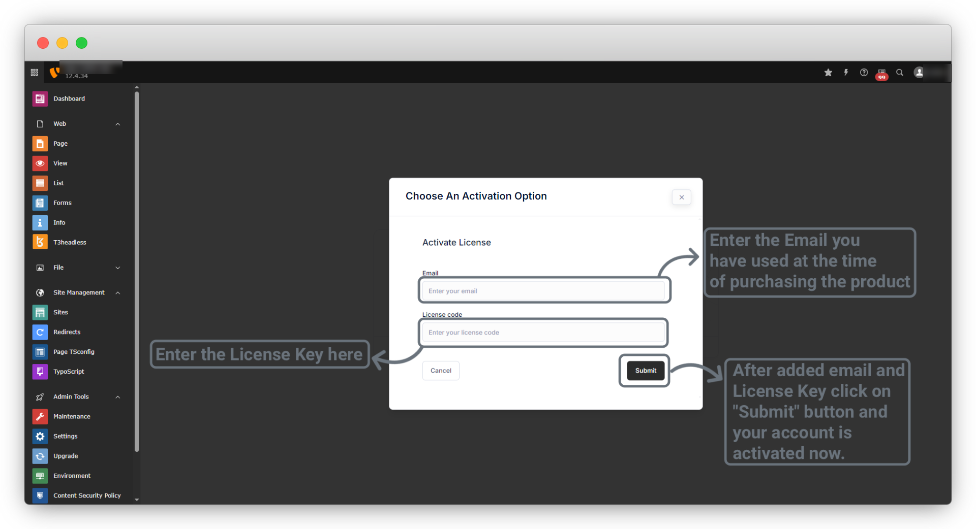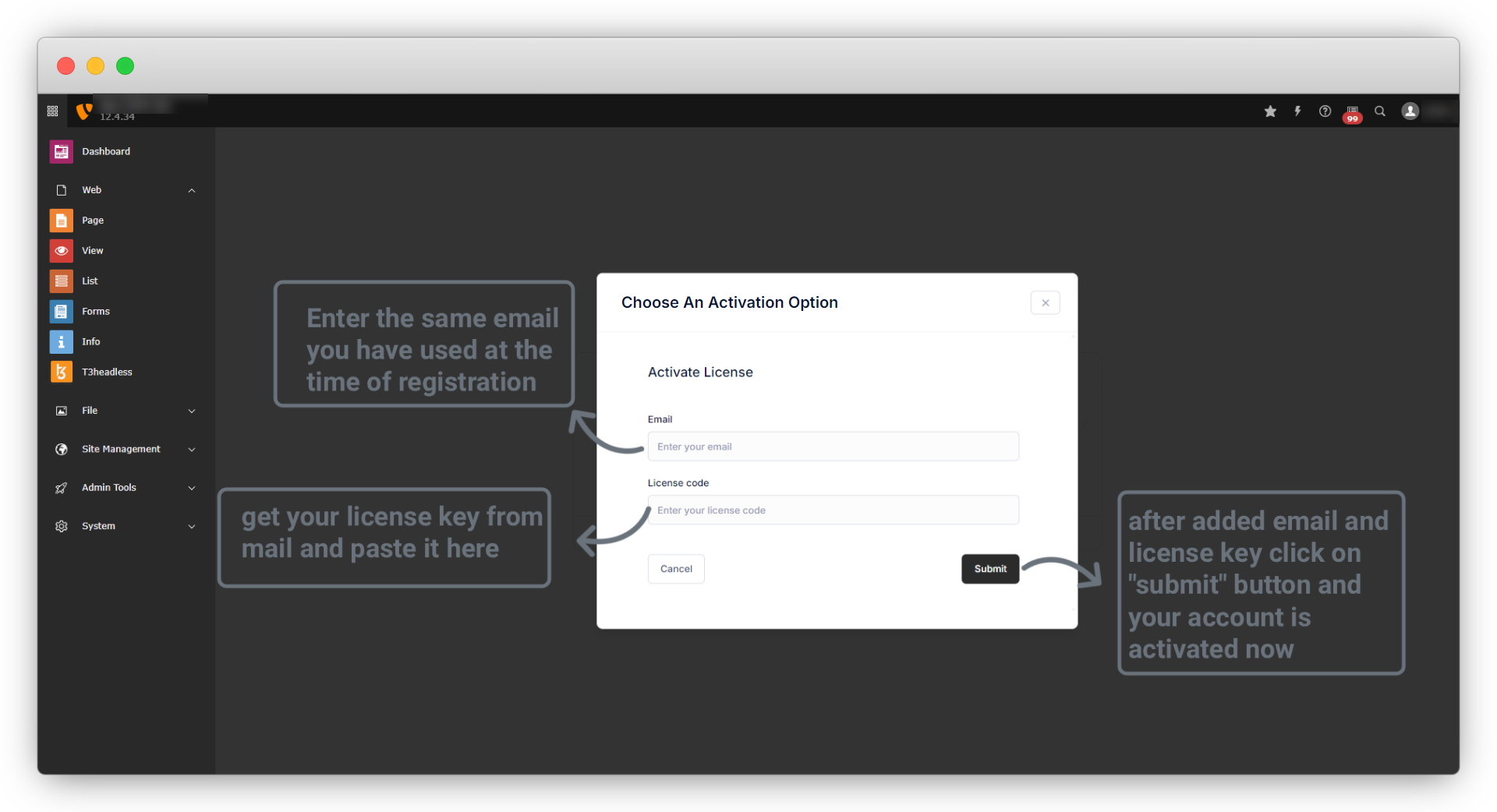 2. And you will see the screen as seen in the screenshot below. Now please enter your email and the license key and click on the button “Submit”.