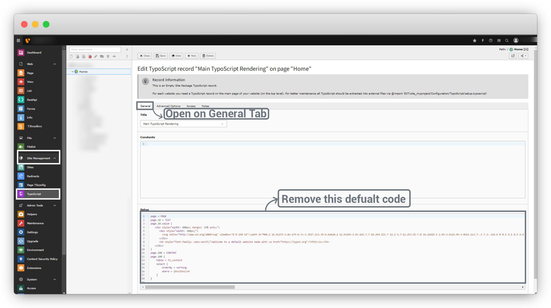 2. Go to the General Tab and remove the default Setup TypoScript of the default TYPO3 installation.
