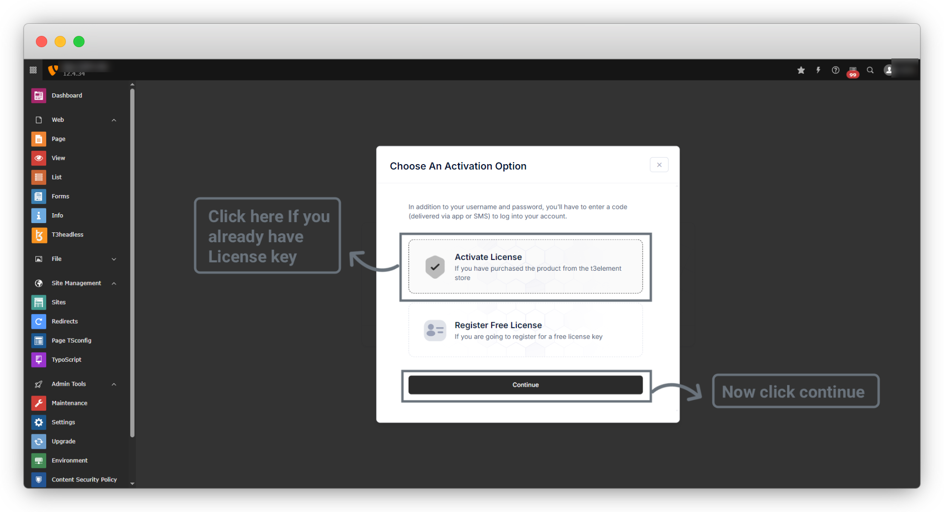 1. Please check your mail from T3element to find the license key, and select “Activate License” and then click on “Continue”.