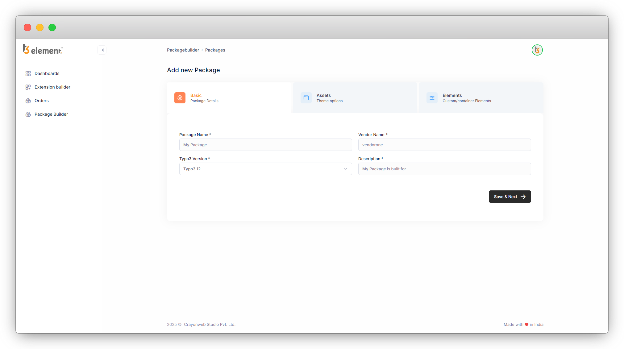 1. Enter your package name, Vendor Name, Typo3 version and Description, and click on “Save & Next” button. The Vendor Name will be converted to lowercase and will remove the space automatically if you have entered the Vendor Name in any other case except lowercase or have added any space.