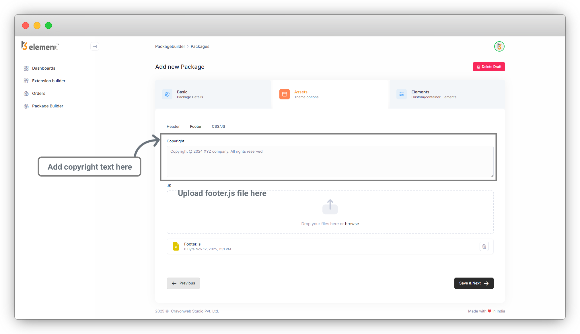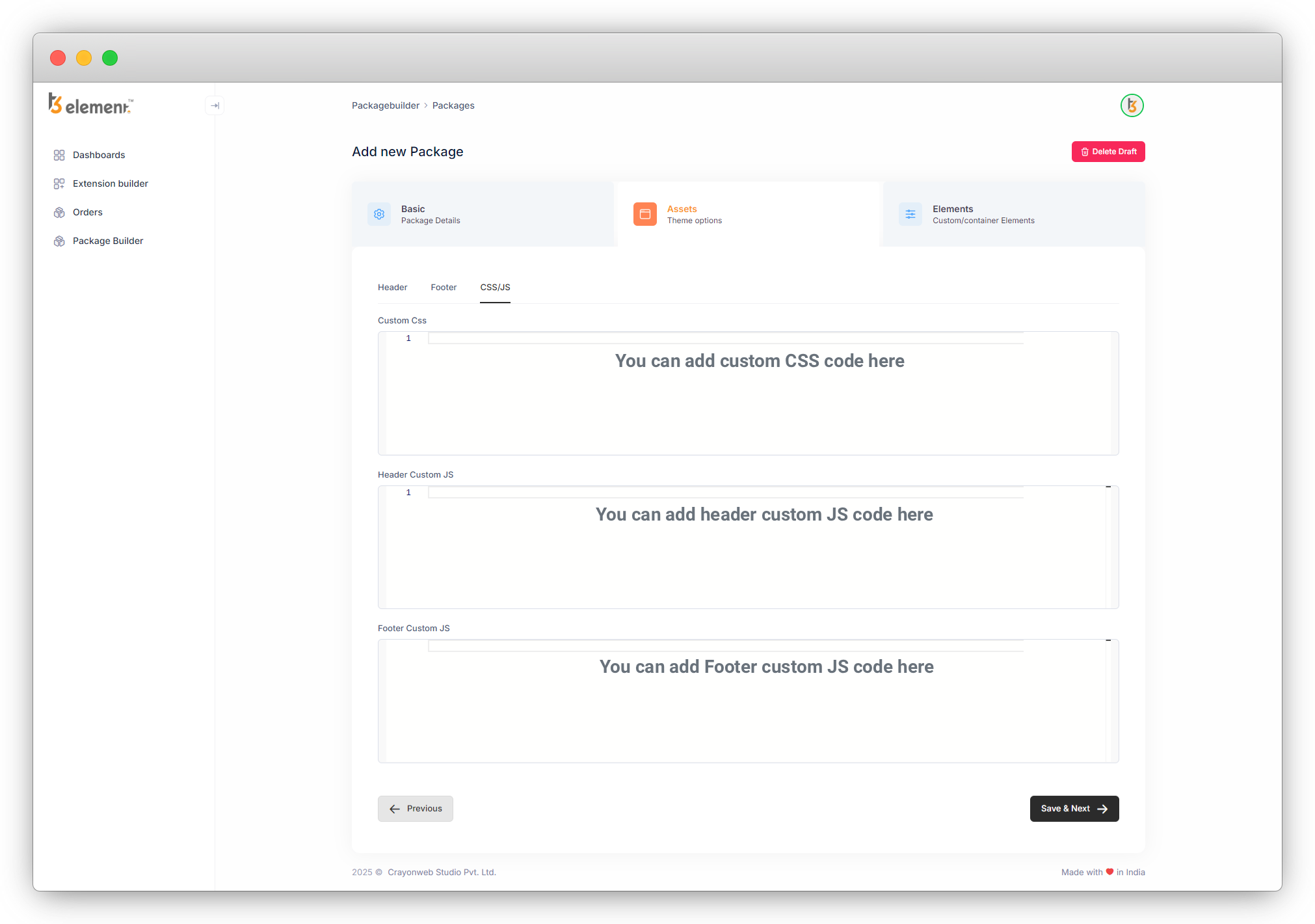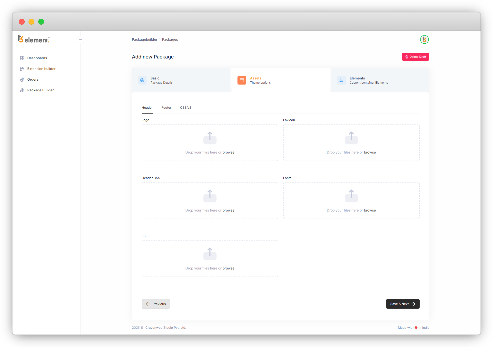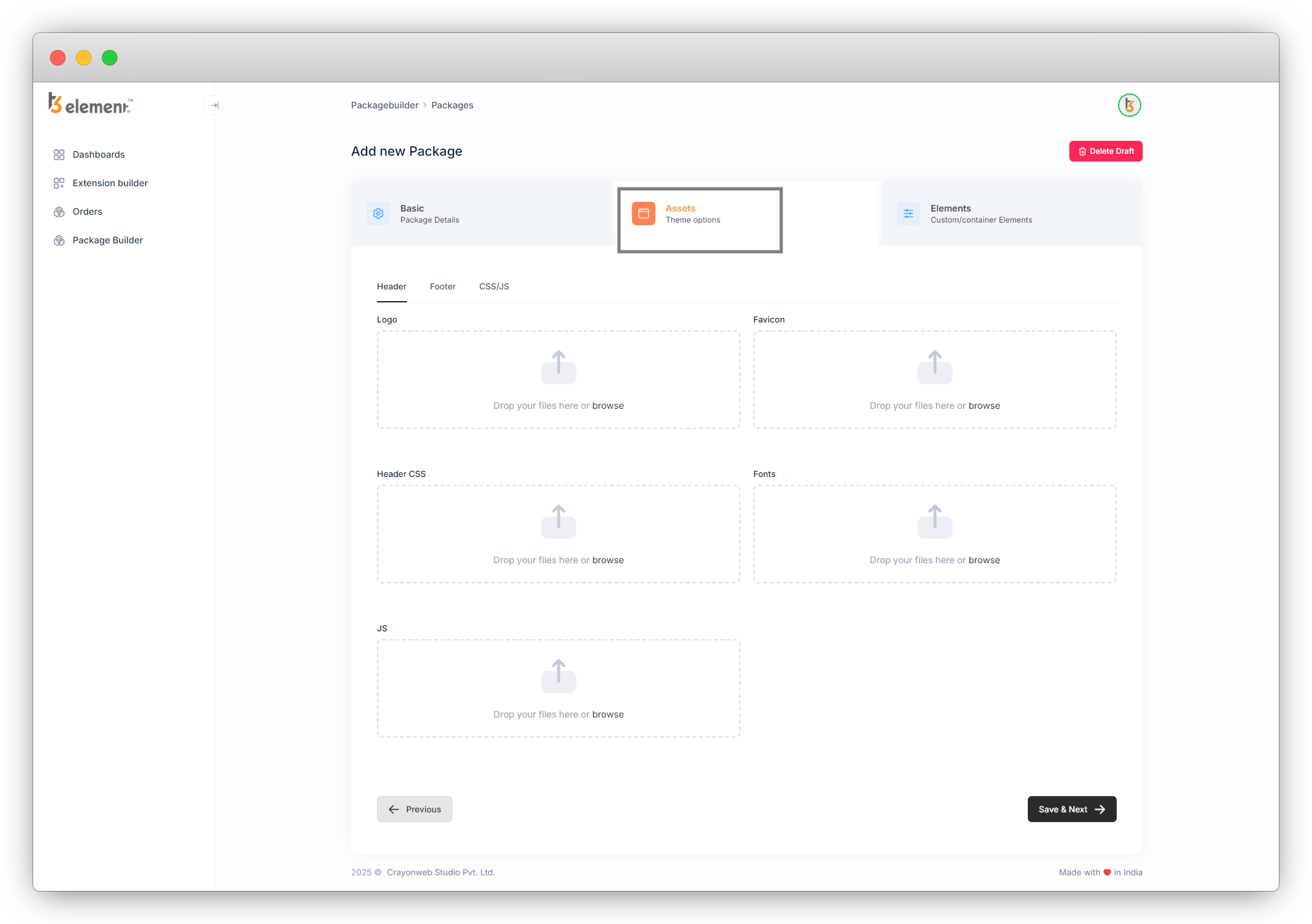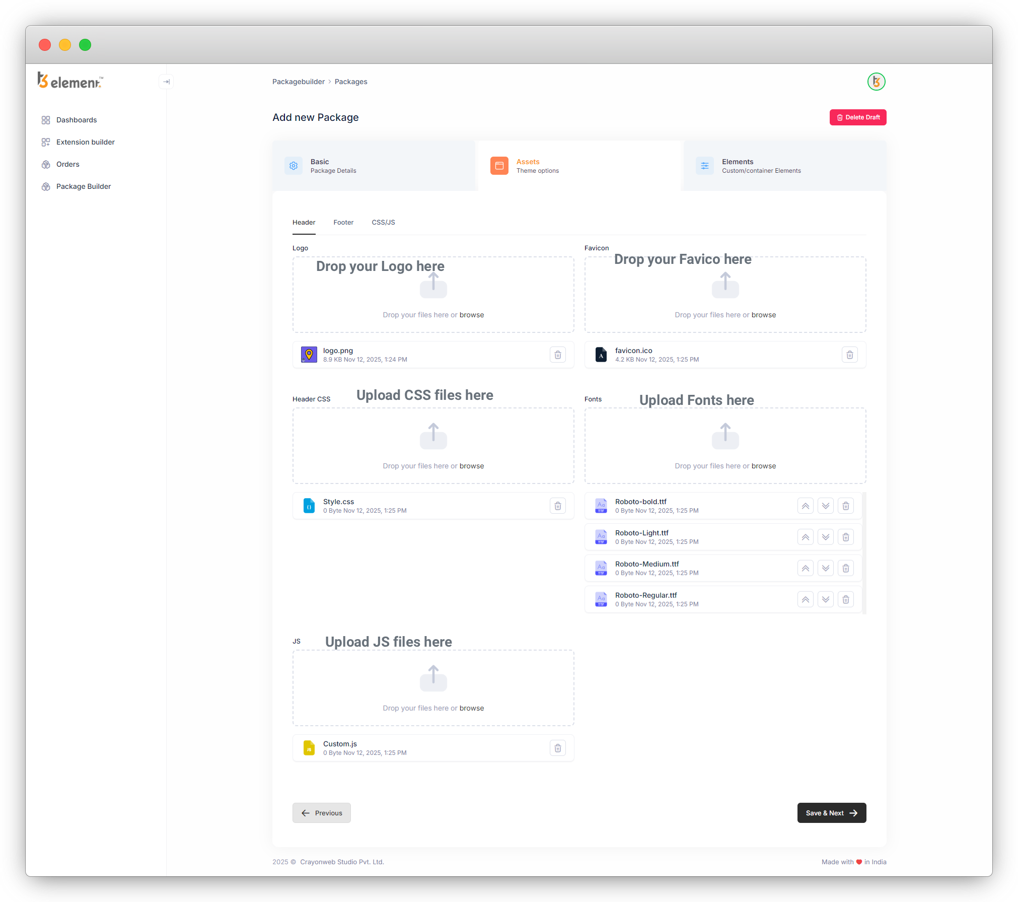 After creating custom elements, now add assets to the package. Here you can upload some basic assets like logo, favicon, CSS/JS files, fonts, etc.