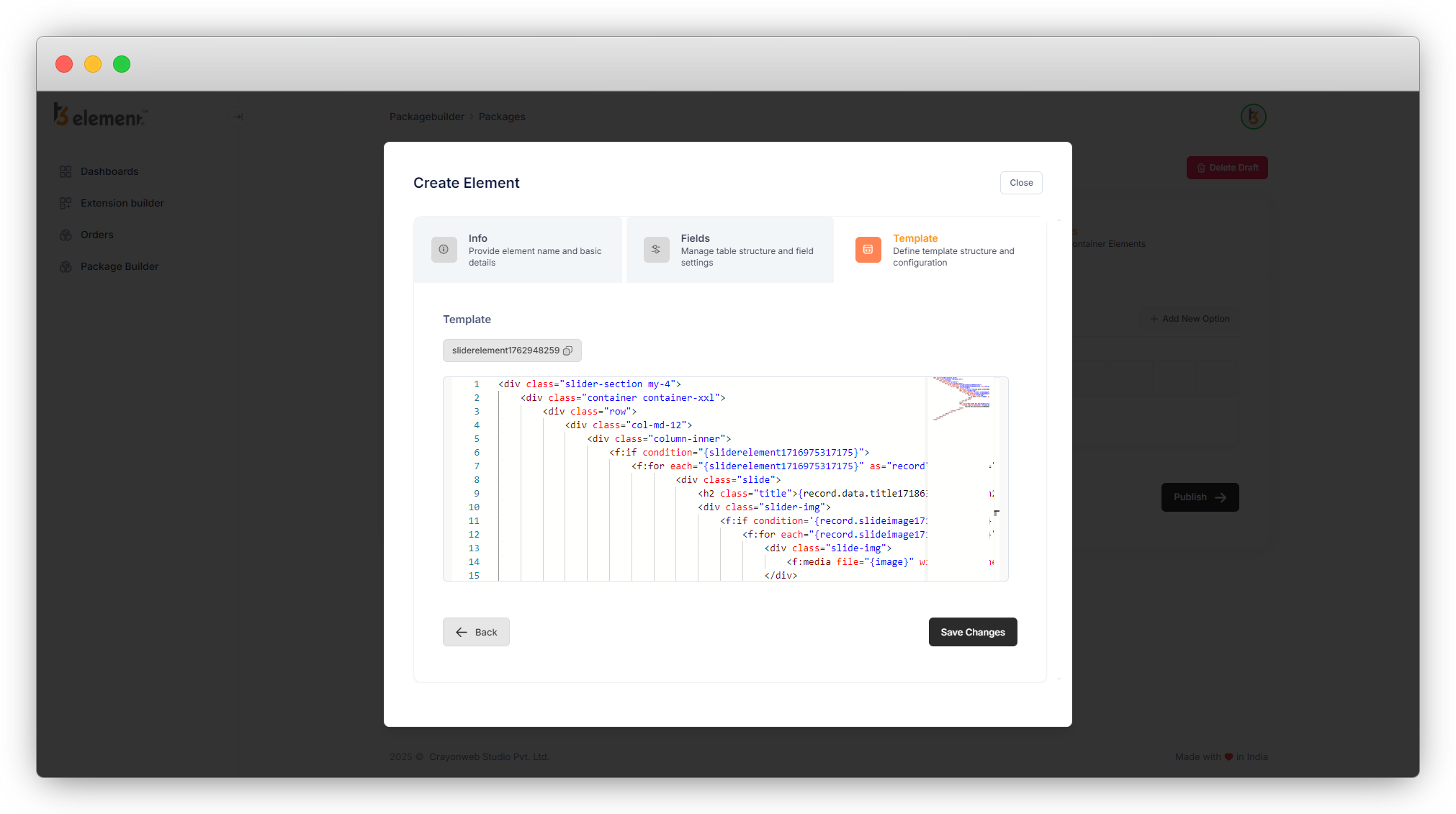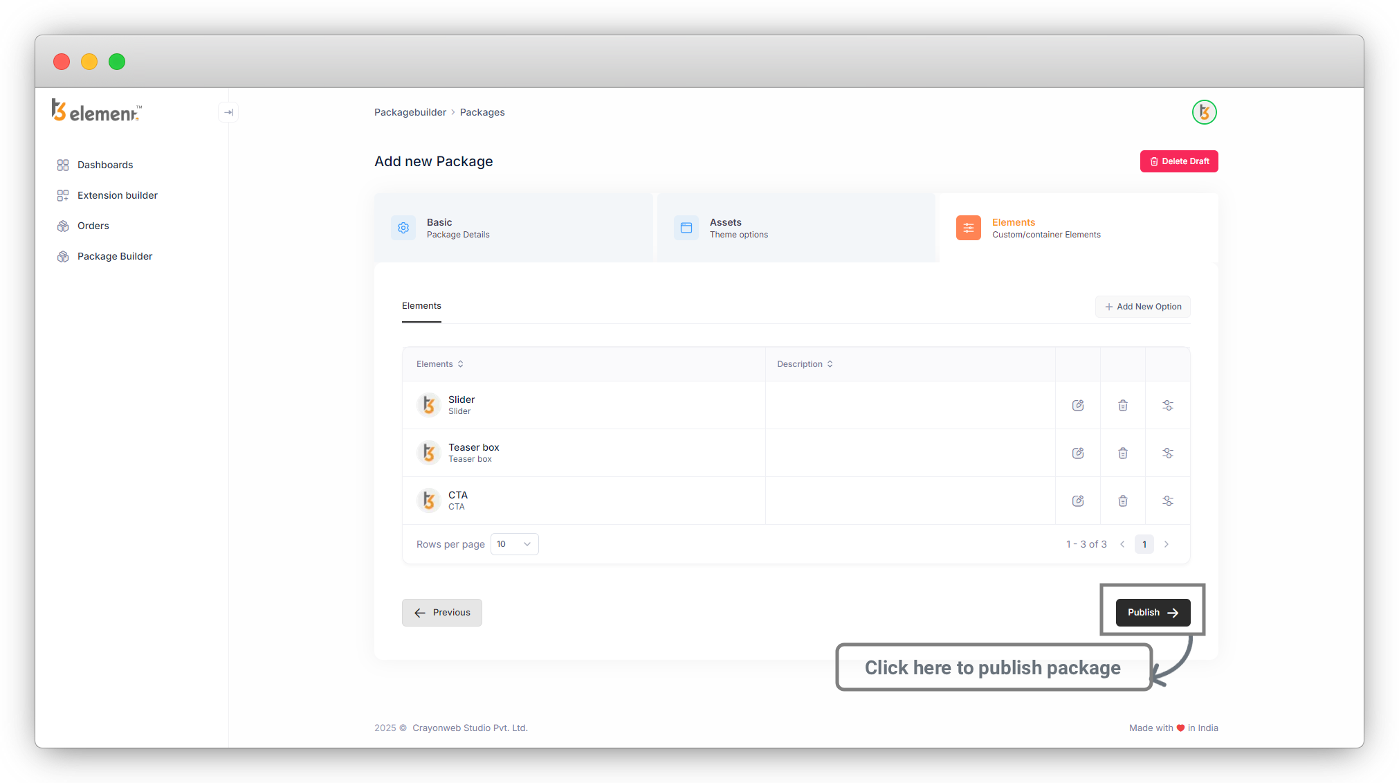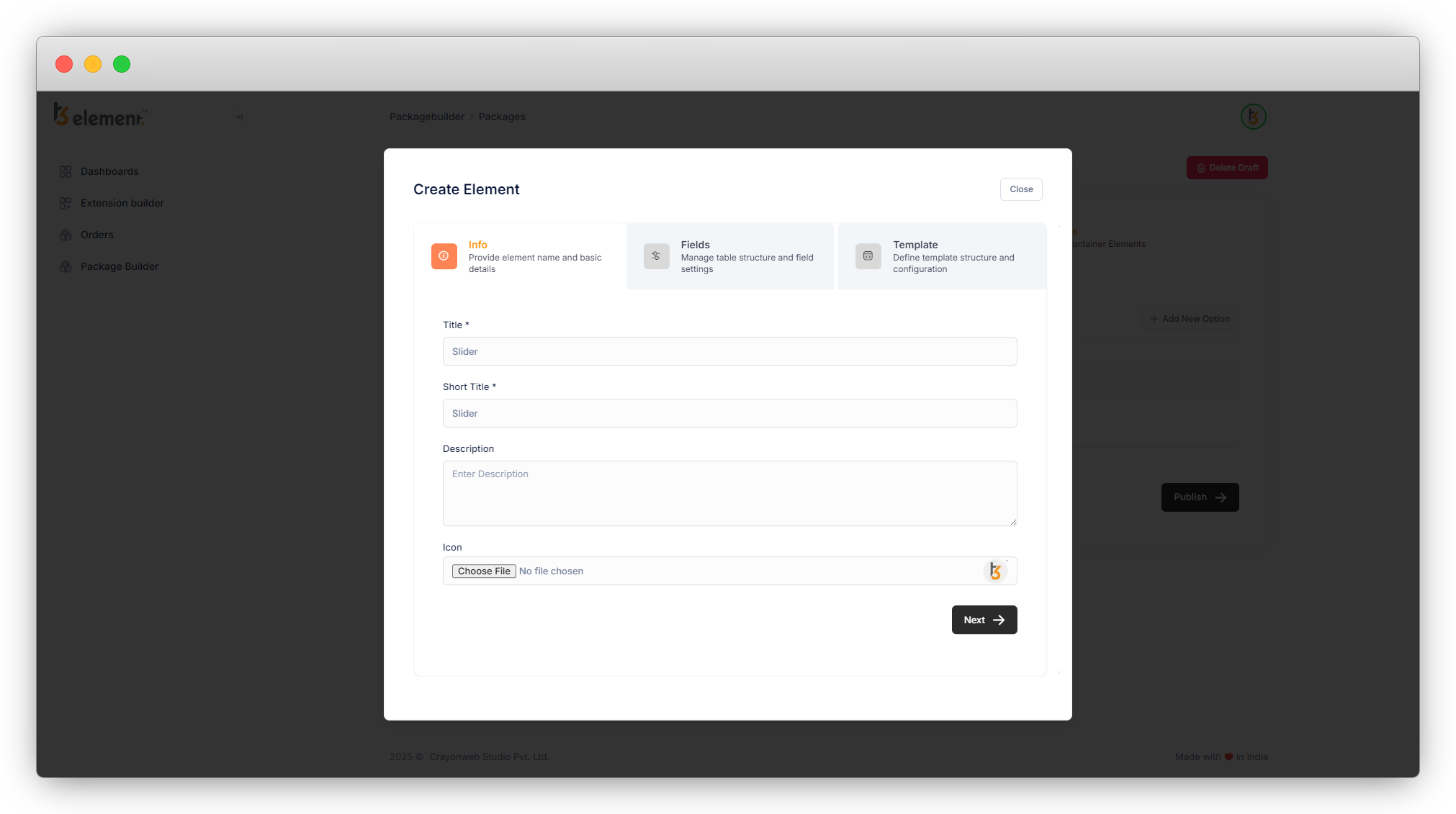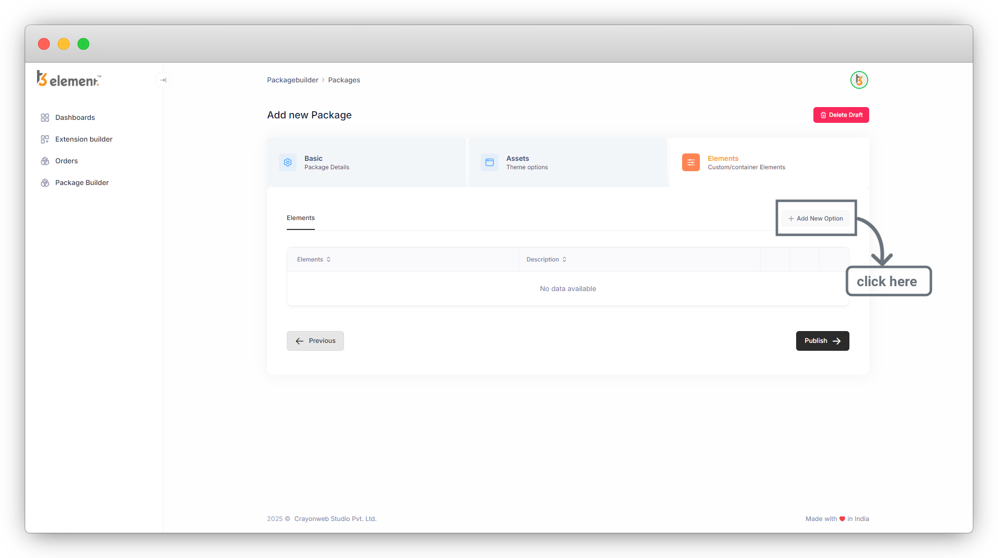 1. After registration, you can create your package, and in that package, you can create your custom elements. You can add multiple custom elements in one package and you can add multiple packages too. Create your package by following below steps: