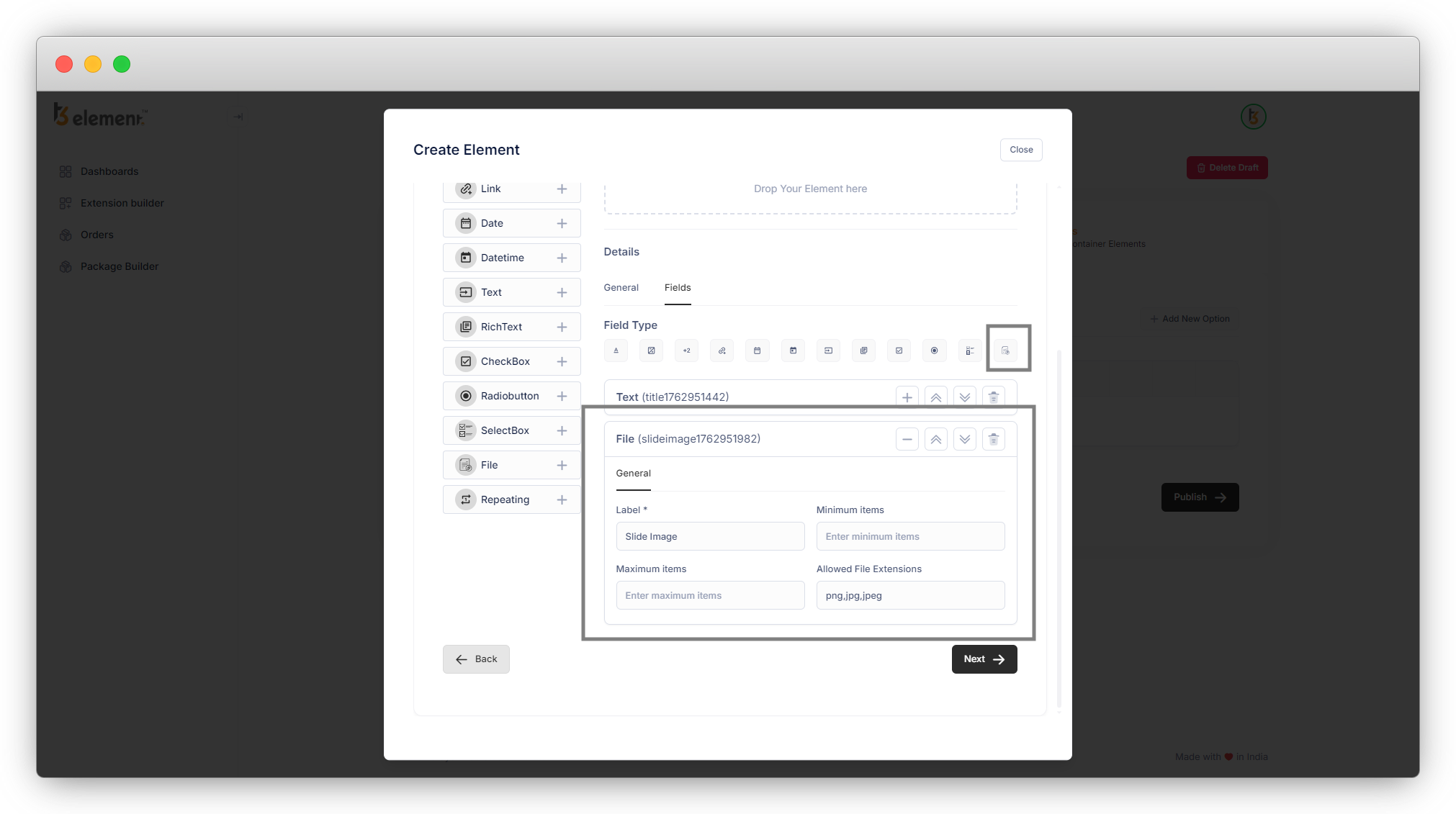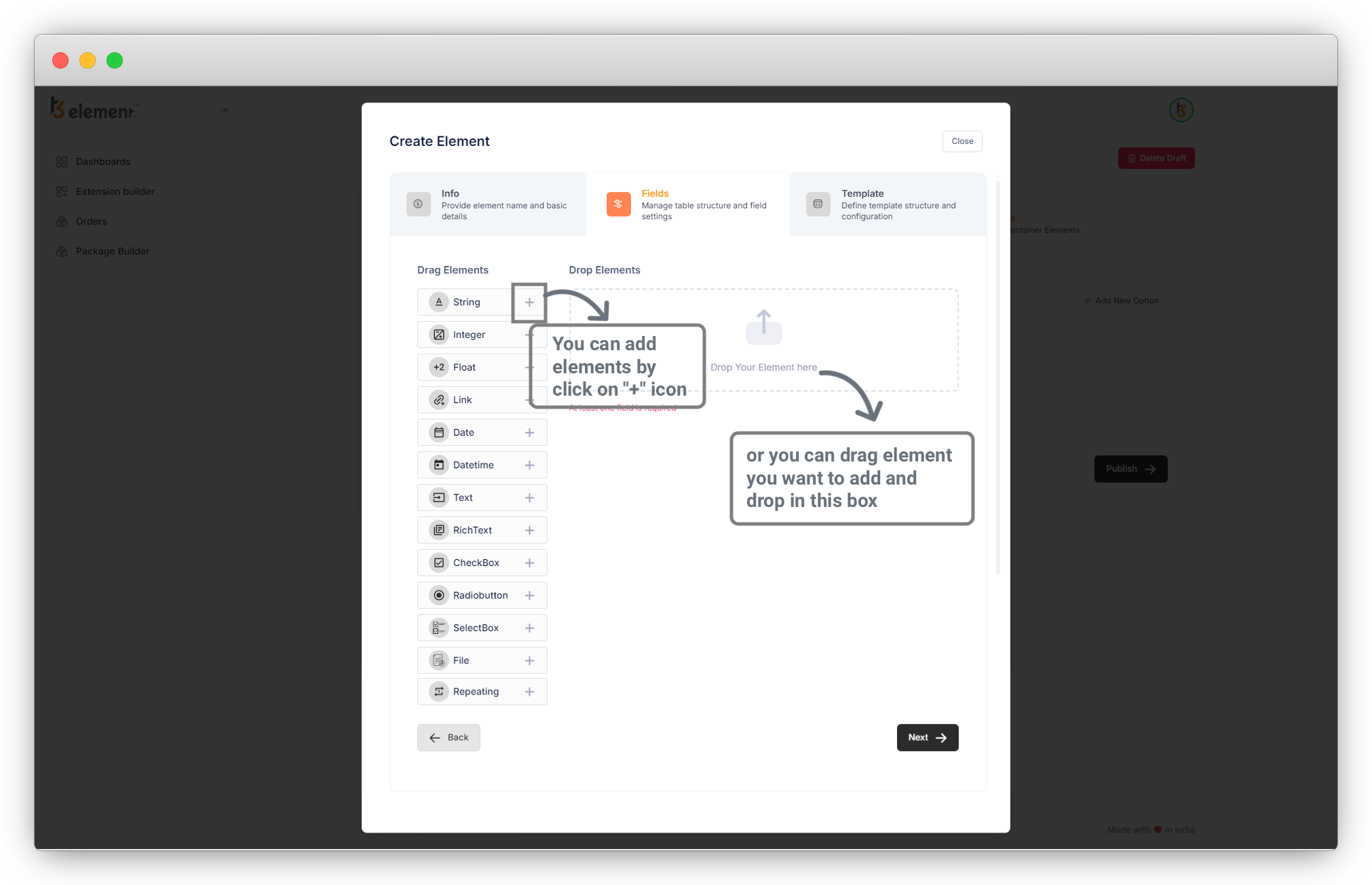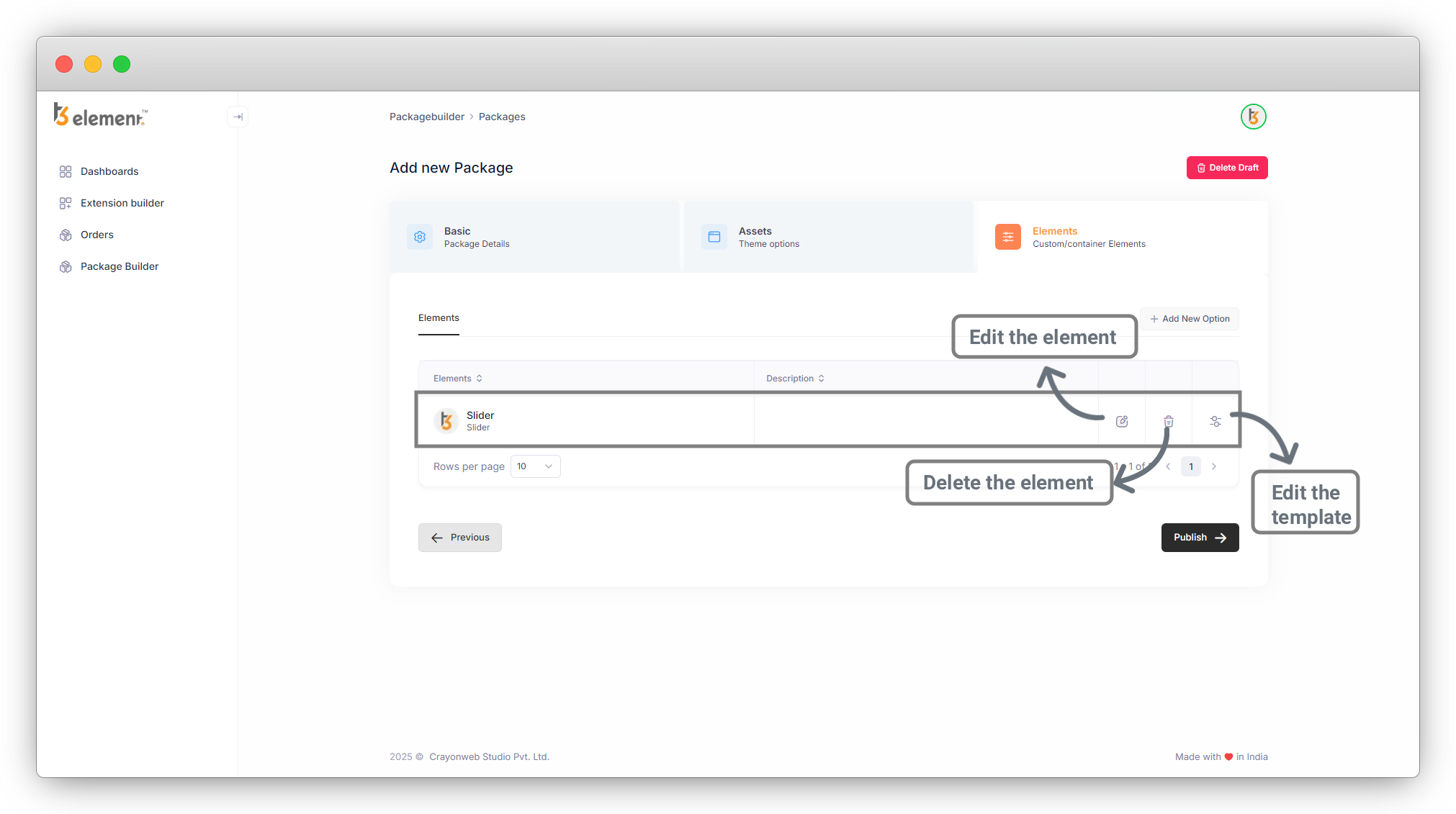 1. After registration, you can create your package, and in that package, you can create your custom elements. You can add multiple custom elements in one package and you can add multiple packages too. Create your package by following below steps: