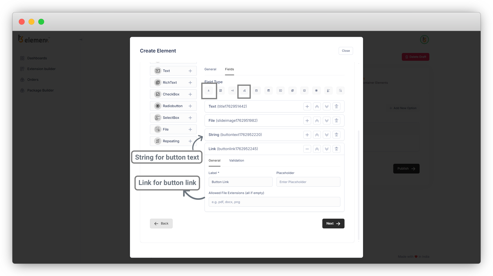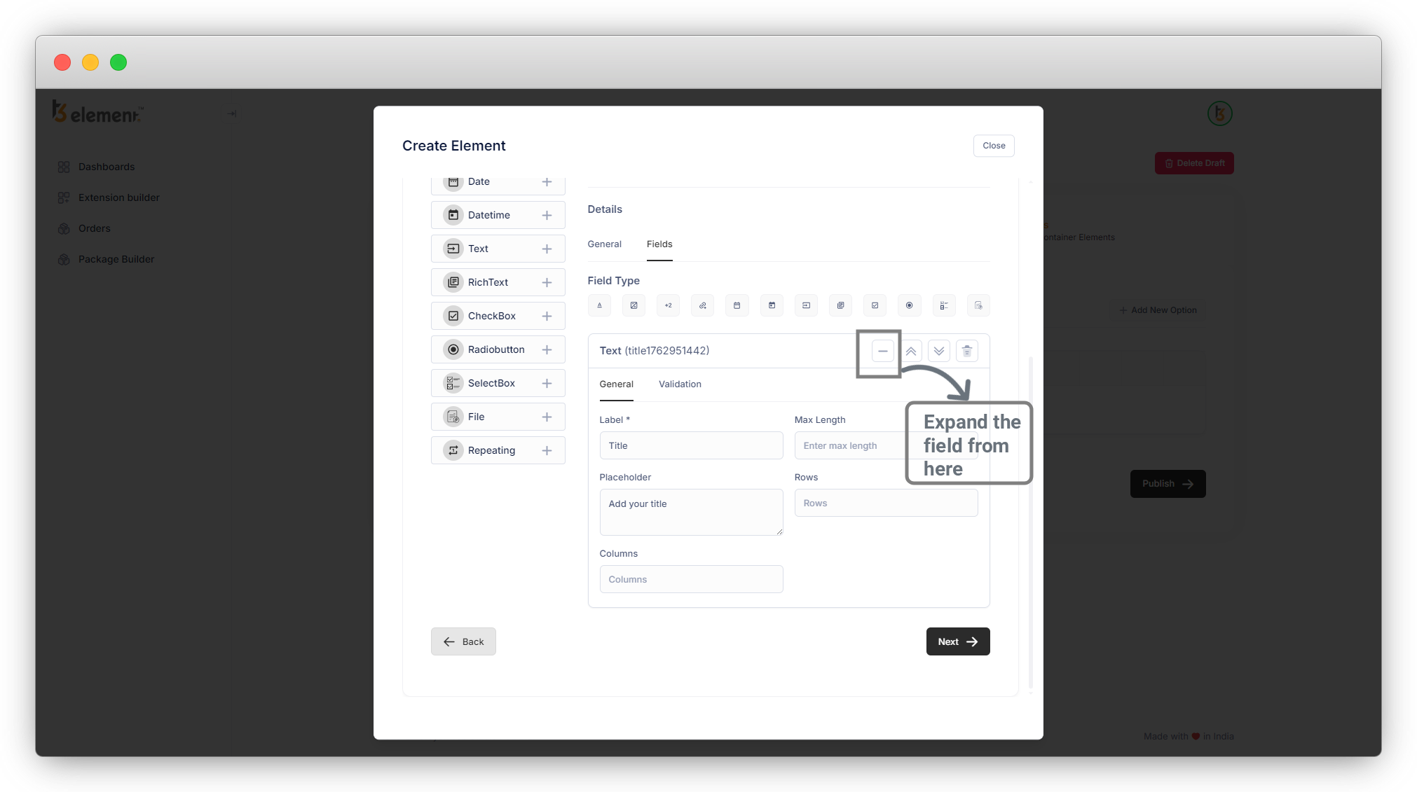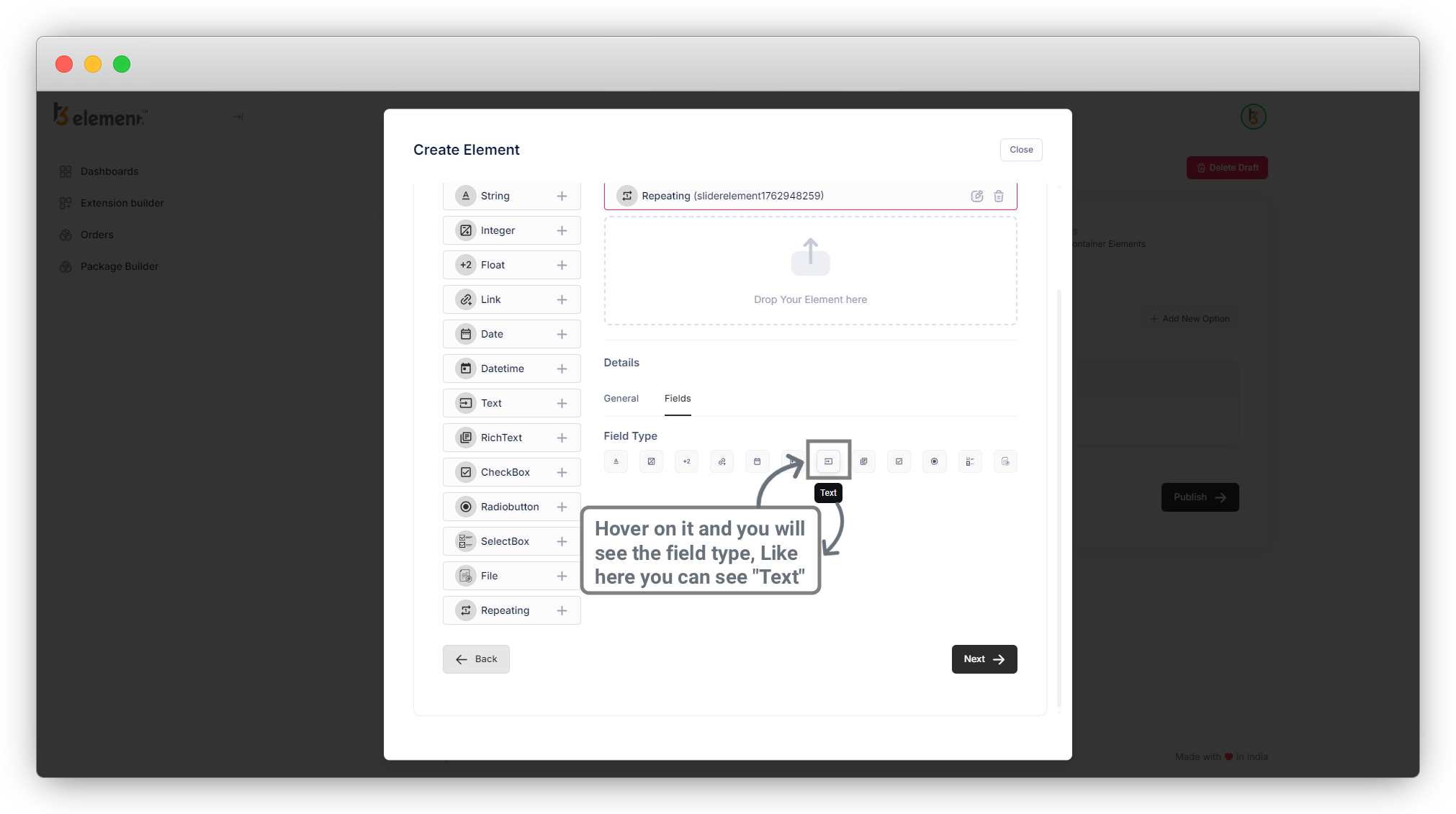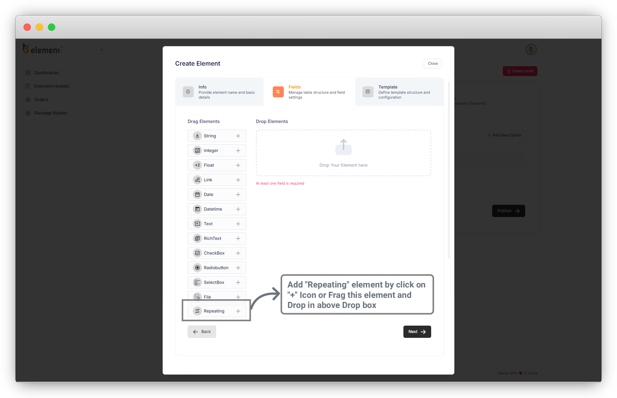 1. After registration, you can create your package, and in that package, you can create your custom elements. You can add multiple custom elements in one package and you can add multiple packages too. Create your package by following below steps: