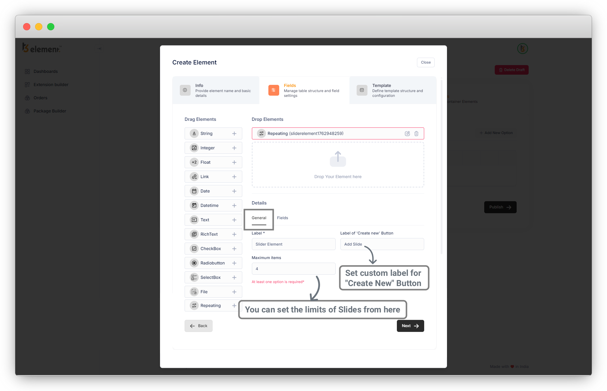 7. Now all the required fields are added, press on the “Next” button and you will see the template which has been generated according to the fields you chose to create the Slider element.