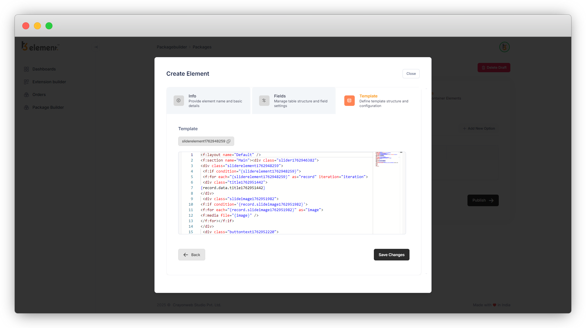 1. When you click on the “Save Template” button, you will find the element you just created in the element list as you can see in the below screenshot and you can edit or delete the element and you can edit the template file also.