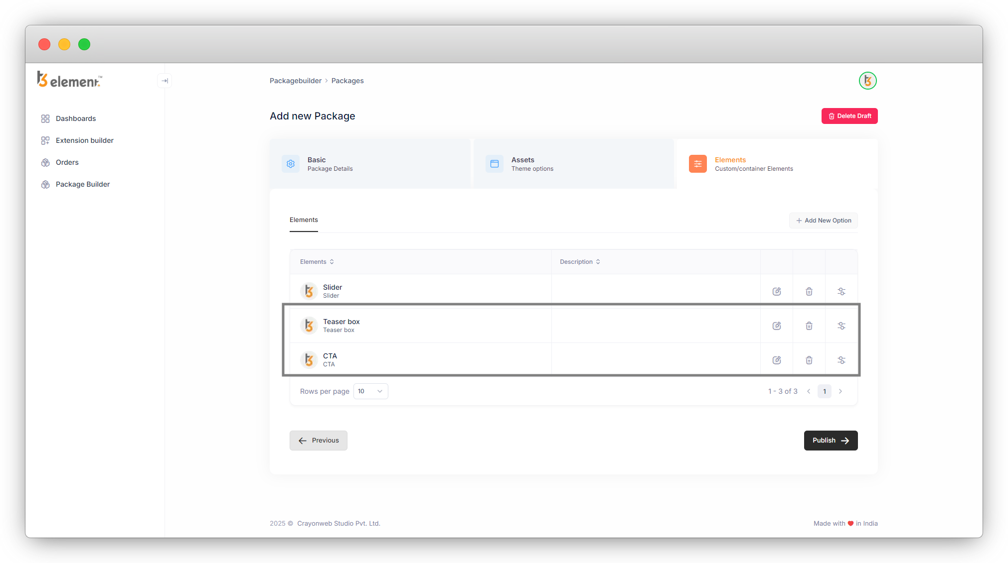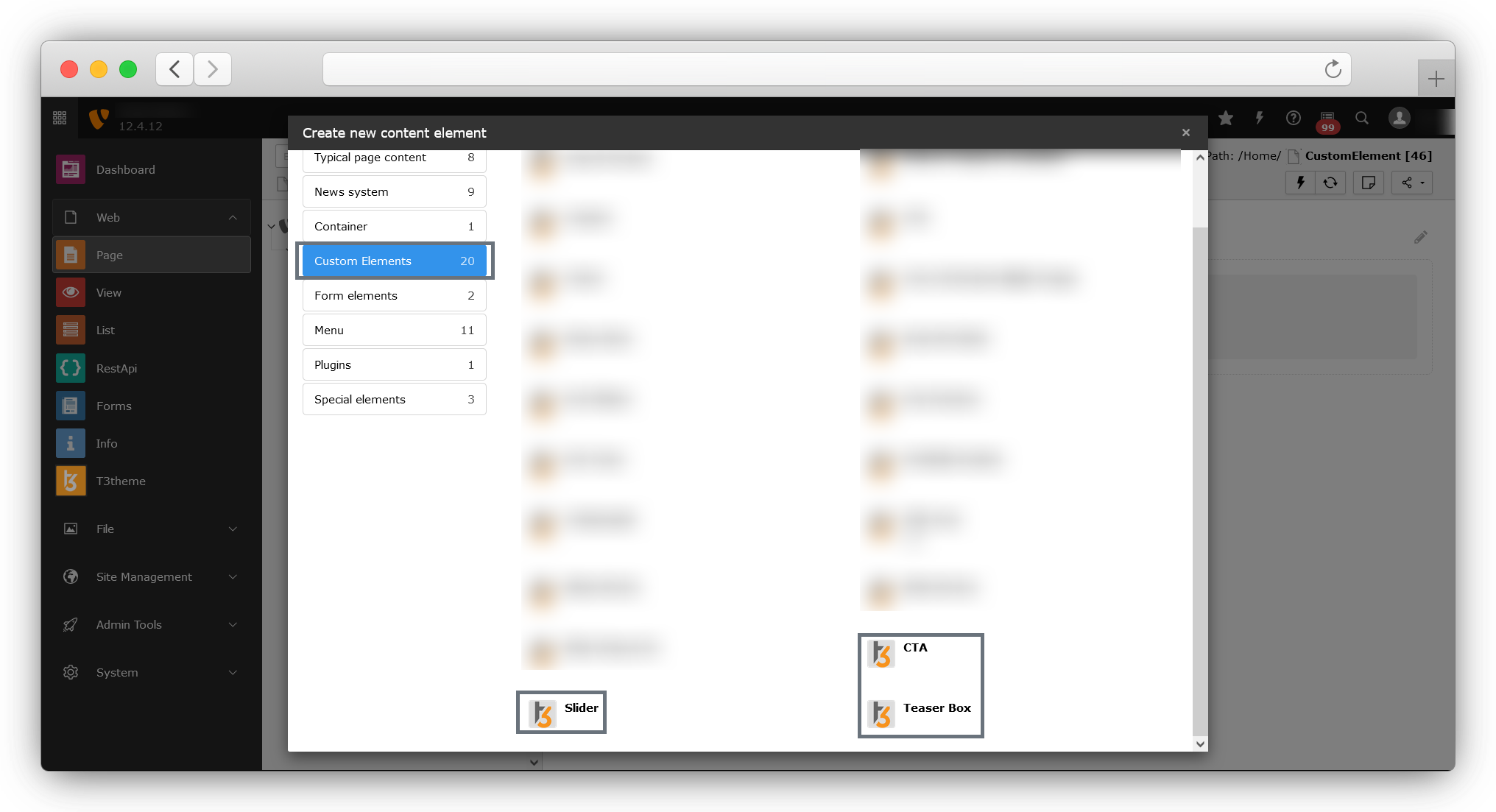 As mentioned before, you can add multiple Elements in one package. Here 2 more elements are added for “Teaser box” and “CTA (call to action)” as you can see in the below screenshot of the custom element’s list.