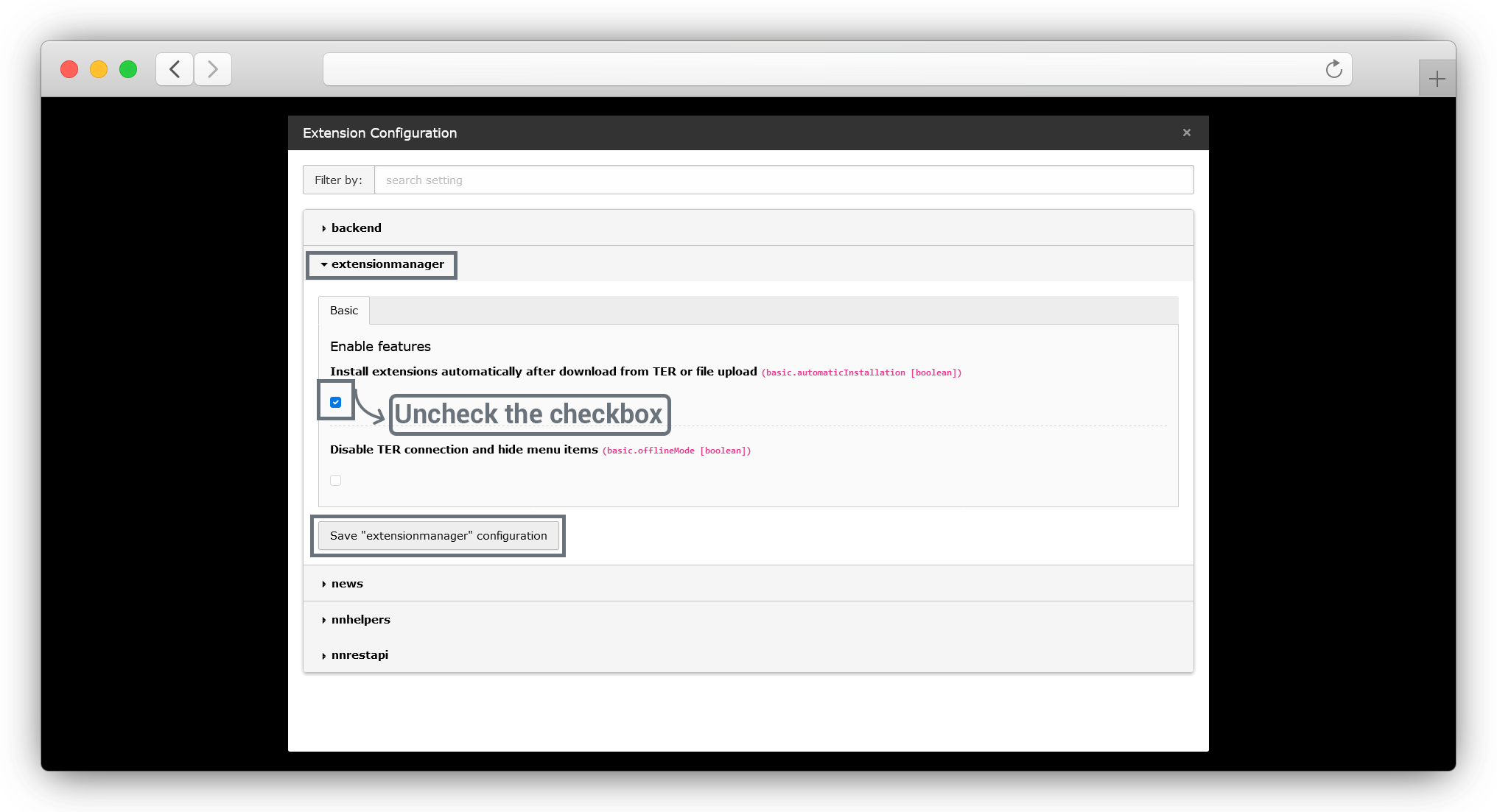 Then the popup will open as seen below screenshot, in that popup go to the extensionmanager > Install extensions automatically after download from TER or file upload (basic.automatic Installation [boolean])) and uncheck the checkbox & click on the Save “extensionmanager” configuration button.