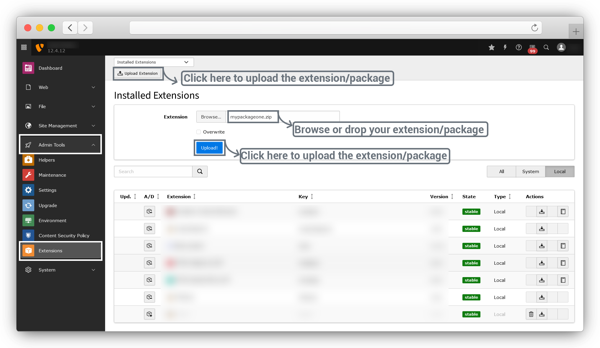 1. Go to the Admin Tools > Extensions tab from the left sidebar. Upload the extension/package you have created with T3element Builder by following the above process.