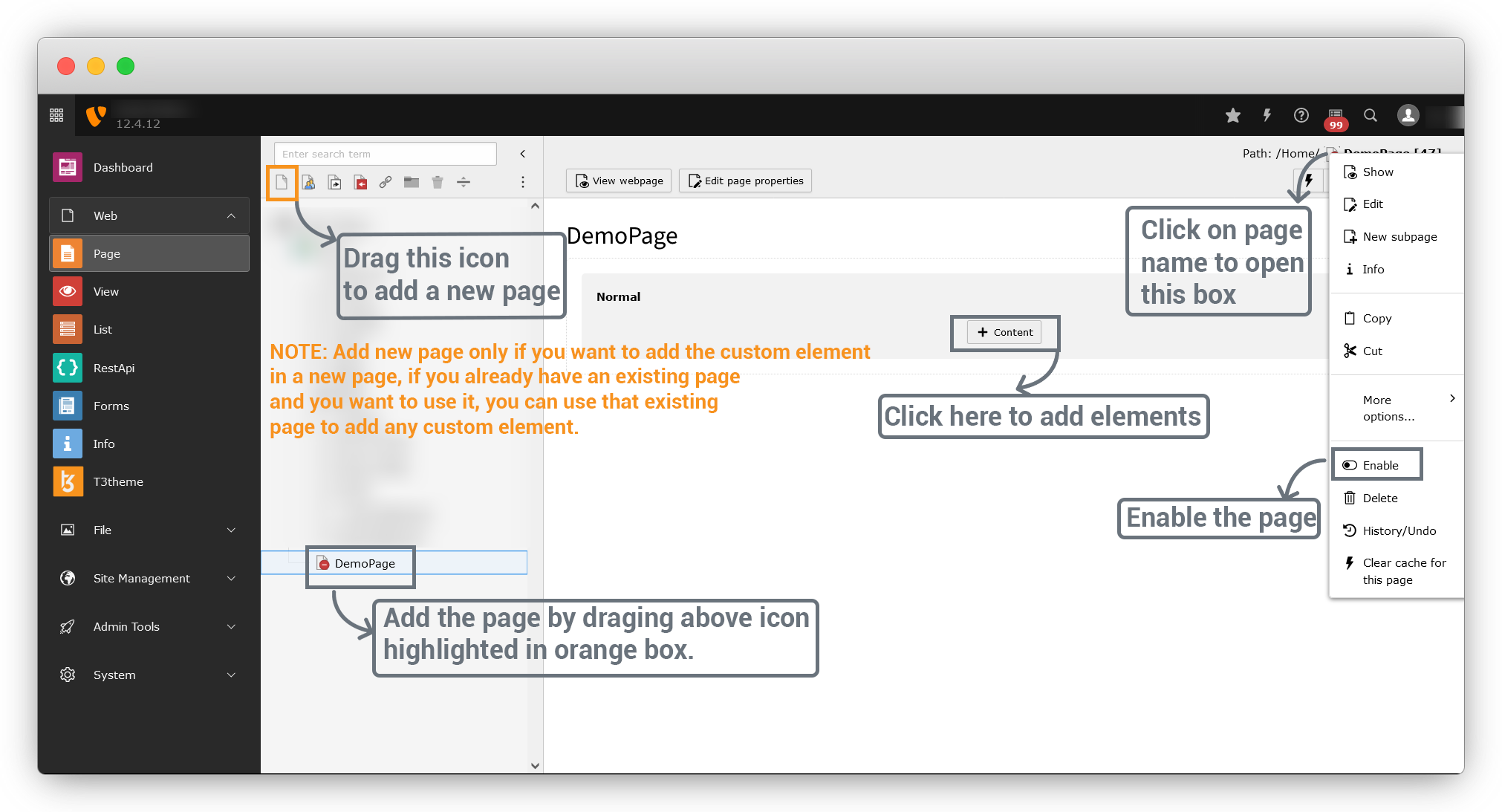 1. Go to Web > Page from the left sidebar, add a new page where you want to add your custom elements and enable the page.