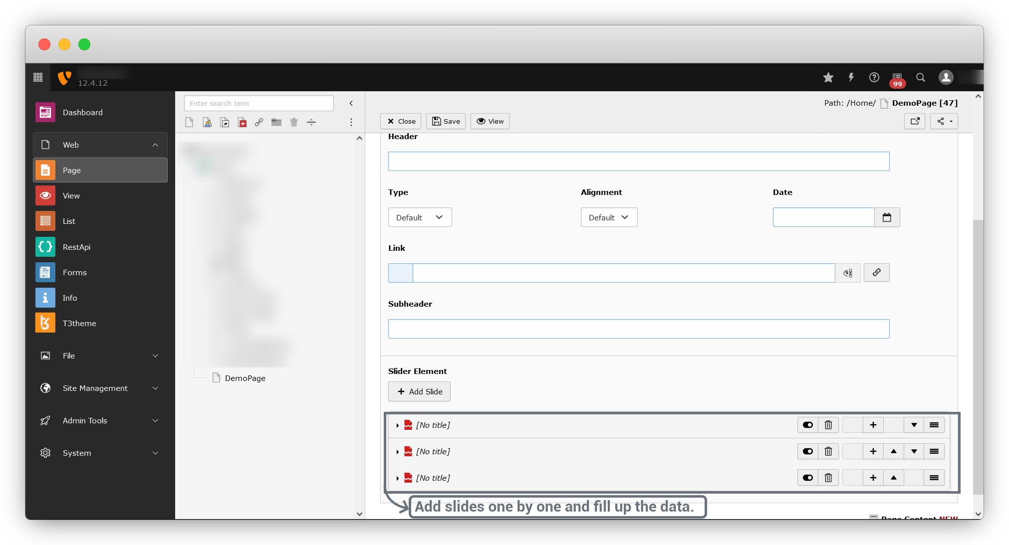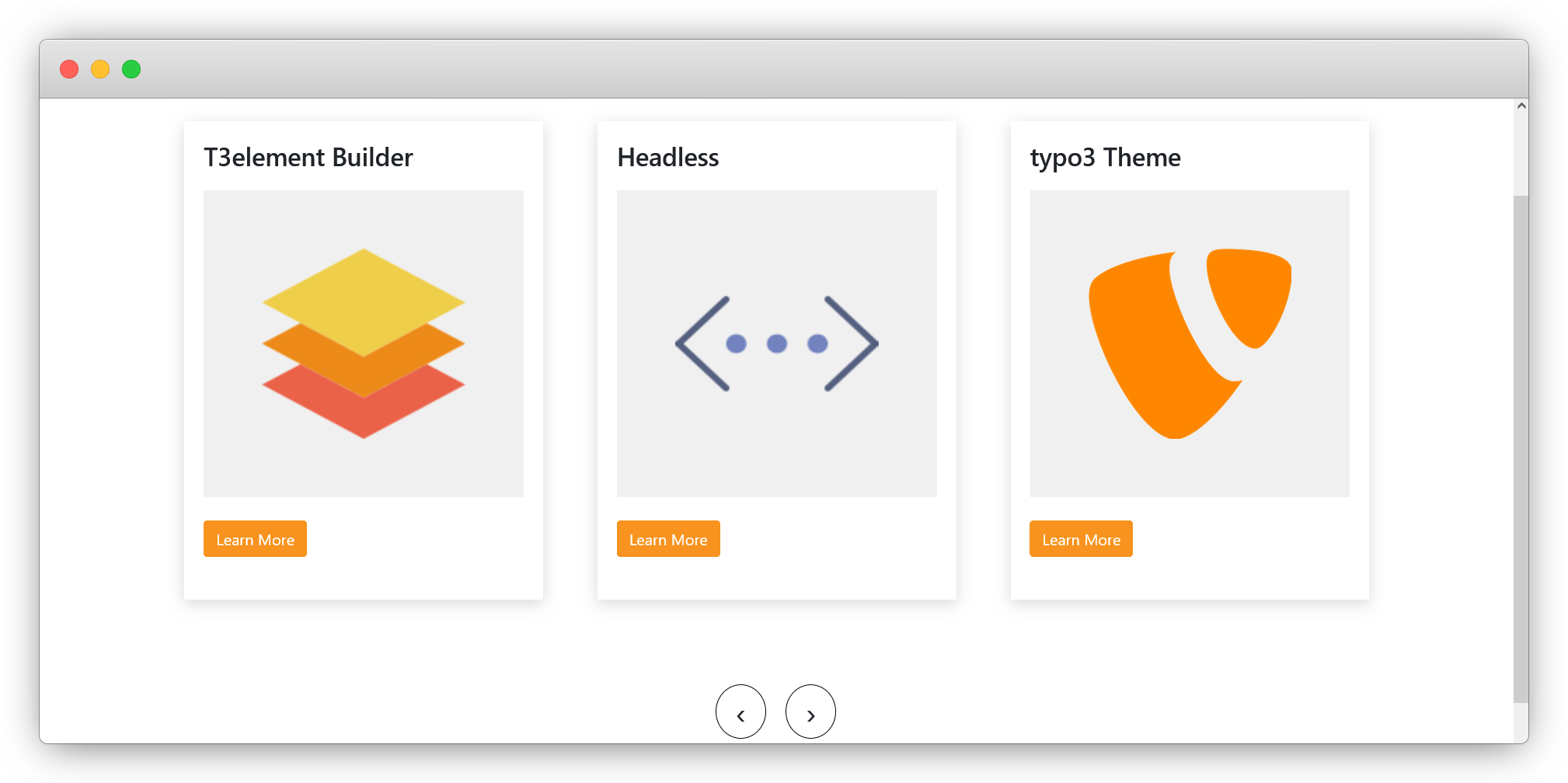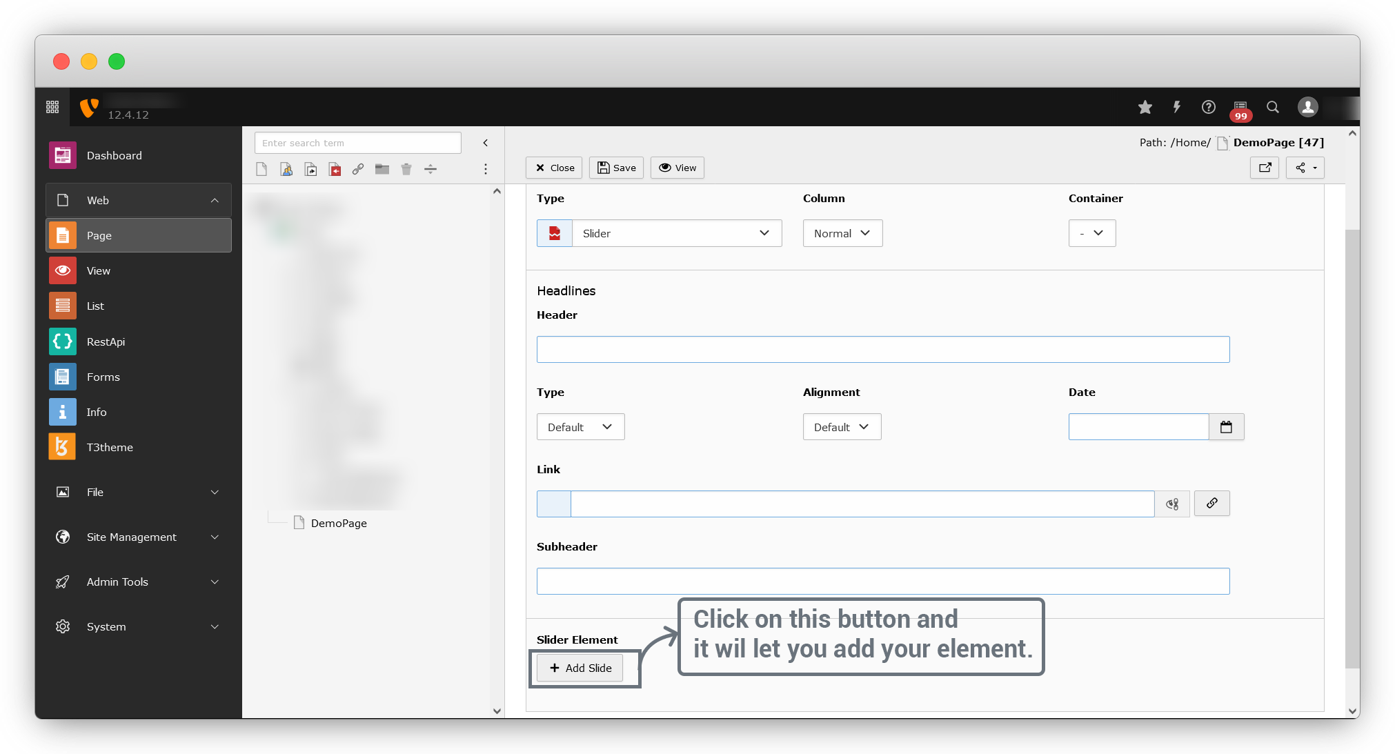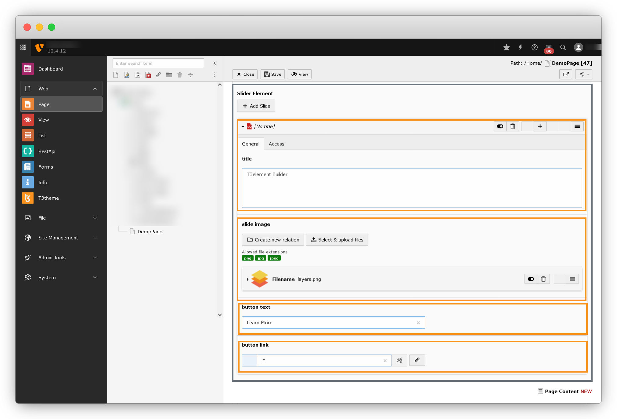Here is an example. Let’s create an element to be more clear about how to create custom elements by using T3Element Builder. Let’s create a Slider element.
