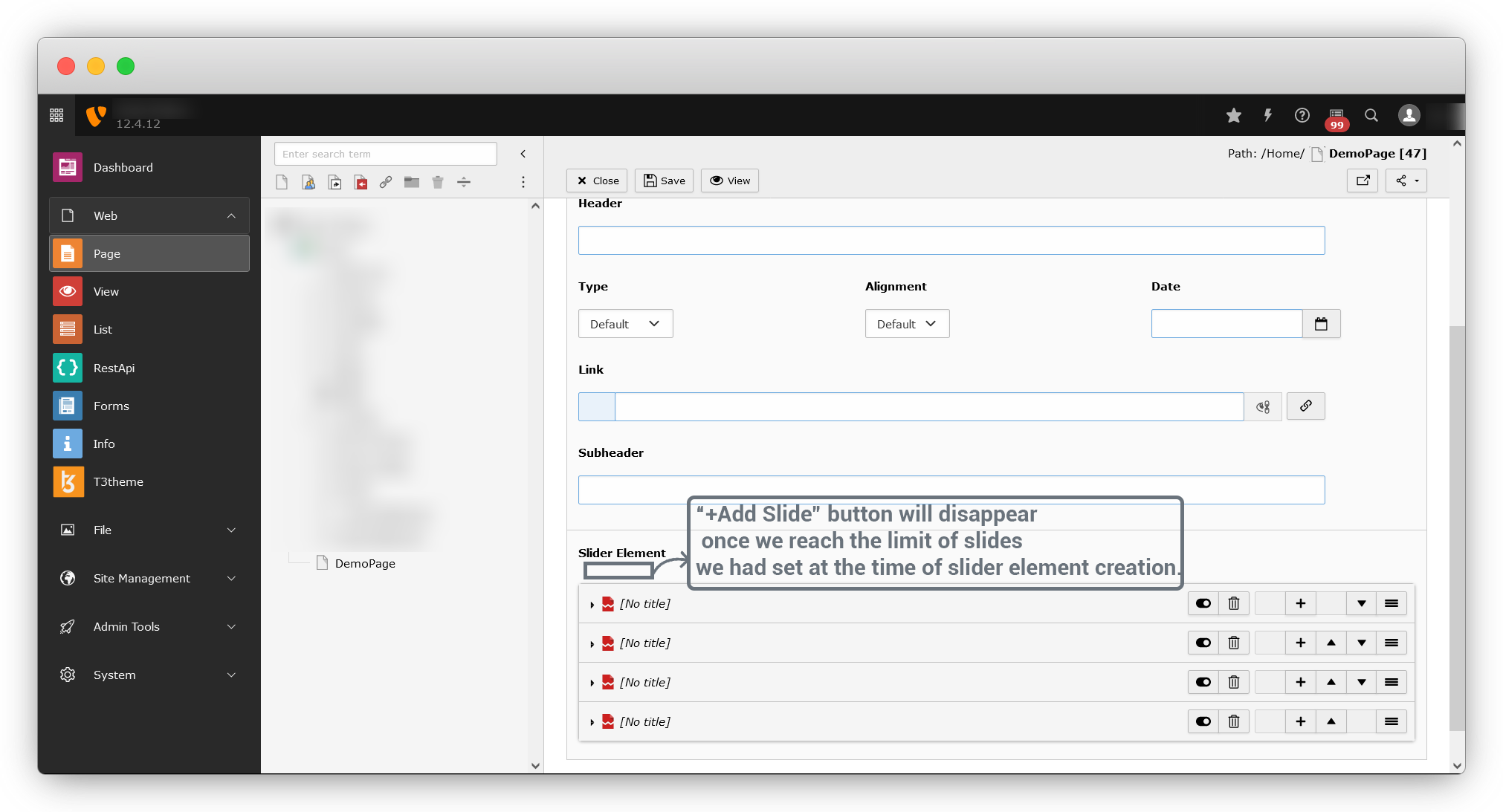 In this example, we set the maximum item limit of slides to 4 in the Slider Element (1.5), so after the 4th slide has been added, the “+Add Slide” button will disappear.