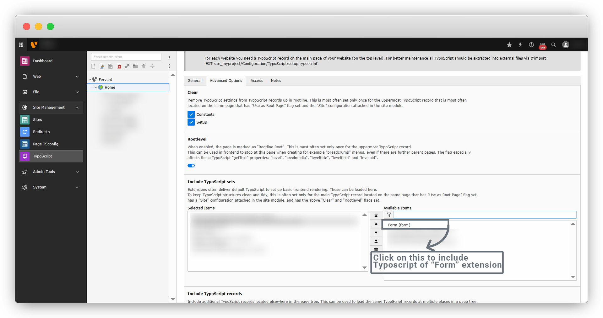 3. Now include the typoscript of form extension. Go to Site Management > TypoScript > select root page > Edit TypoScript Record and click on Edit the whole TypoScript record button.