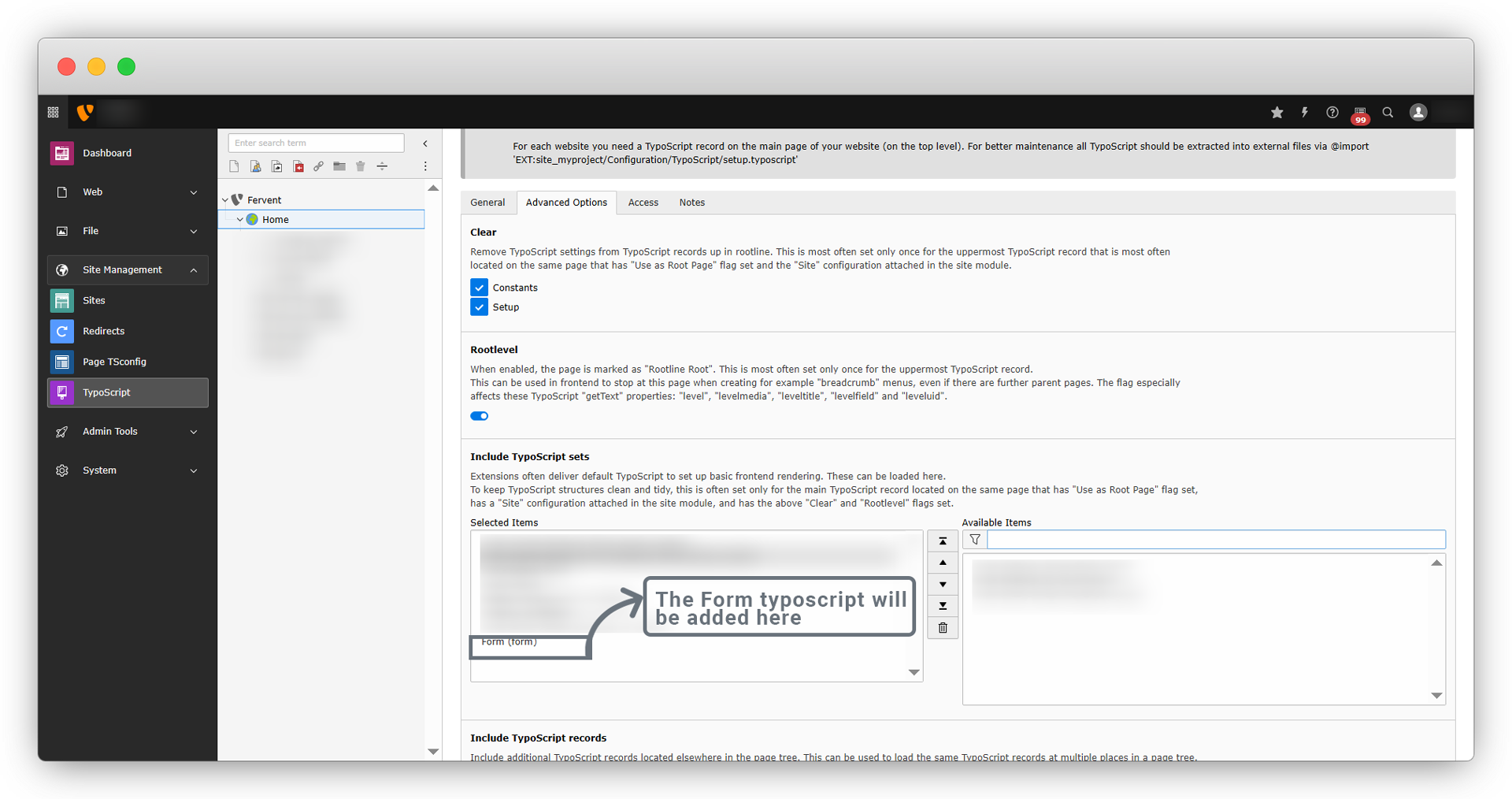 4. Typoscript: You will have to write the typoscript in the admin panel. Open the TYPO3 admin panel, go to Site Management > Typoscript, select the root page and select the “Edit Typoscript Record” option and click on the “Setup”.